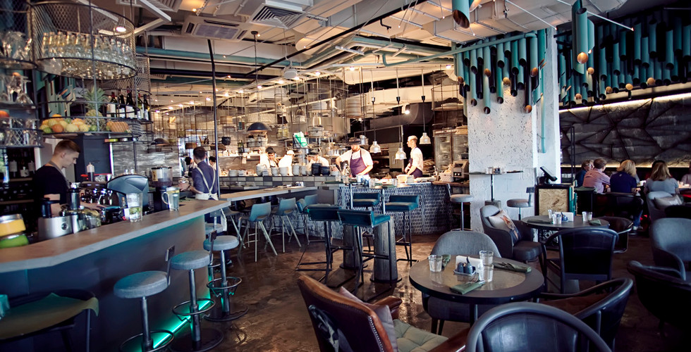 В зале большая открытая кухня, на ней готовят всё от блюд до заготовок, а также хлеб, масло, сыр, мороженое — за всеми процессами удобно наблюдать из-за столов. Барная стойка стоит отдельным островом в зале. Терраса ресторана прячется под крышей, так что гостям не страшны ни дождь, ни полуденное солнце.