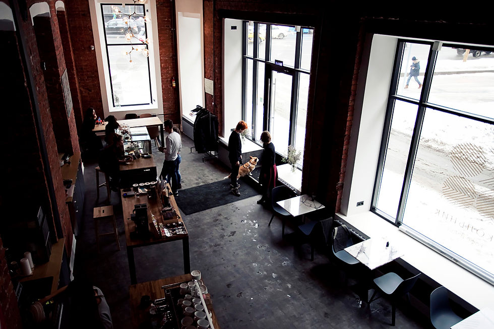 Мы с нашими героями перешагнули порог и попали в минималистичное пространство из кирпича с лестницей на небольшую антресоль. Вдоль наружной стены у высоких окон стояли простые столики с журналами, а по другую располагались корнер с едой и стойкой бариста. Здесь варят как классику, так и альтернативу, используя зерна от обжарщиков West 4.